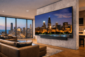 Chicago TV mounting professionals who specialize in installing TVs for business and home. TVs ranging from 32″ to 100”, wall mounting, over-the-fireplace installations, wire concealment, and clean separation from cable systems are secured. There are also general mounting services for art, mirrors, shelves, soundbars, whiteboards, and more.